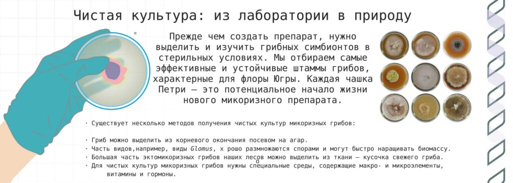 И это готова доказать Лаборатория микологии и микотехнологии ЮГУ. Сейчас учёные нашего университета разрабатывают микоризные препараты улучшения роста деревьев – сосны и кедра, а также для повышения их приживаемости в сложных условиях: на нарушенных почвах, после пожаров, в условиях меняющегося климата. В итоге должен получиться готовый препарат для удобрения саженцев на стадии посадки в питомниках или при рекультивации «бедных», загрязнённых почв.